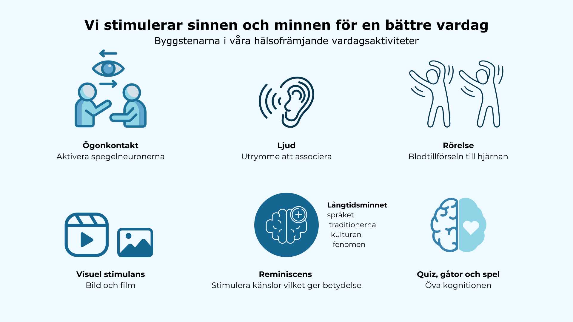 Metoden utgår från ljudets, musikens, bildens, filmens och tillhörighetens förmåga att aktivera individen. Att lyssna tillsammans är en bekant upplevelse för de äldre och för med sig gemenskapskänsla och gamla minnen gör gott att minnas tillsammans.